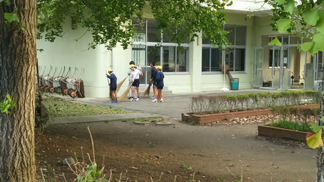 落ち葉が降り出してから続いている毎朝の光景です。落ち葉に負けない6年生です。