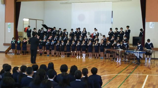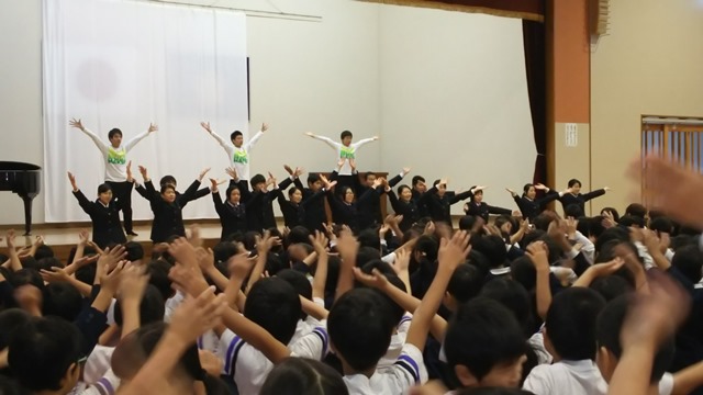 水俣高校音楽部と新体操部が今朝8:10から8:20まで歌の交流会にやってきてくれました。若々しい歌声と新体操部のしなやかな表現を体育館でみんなで堪能しました。短い時間でしたがとてもさわやかなひと時でした。高校生の皆さん、ありがとうございました。