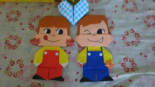 事務室前に季節の折り紙や人気キャラクターの折り紙が飾ってあります。支援員の先生方がていねいに折り重ねて作ってくださったものです。思わず足を止めて見入る作品ばかりです。学校においでになったときにはぜひご覧ください。ちなみに写真はペコちゃんとポコちゃんです。ポコちゃんが両手に持っているものは何でしょう?