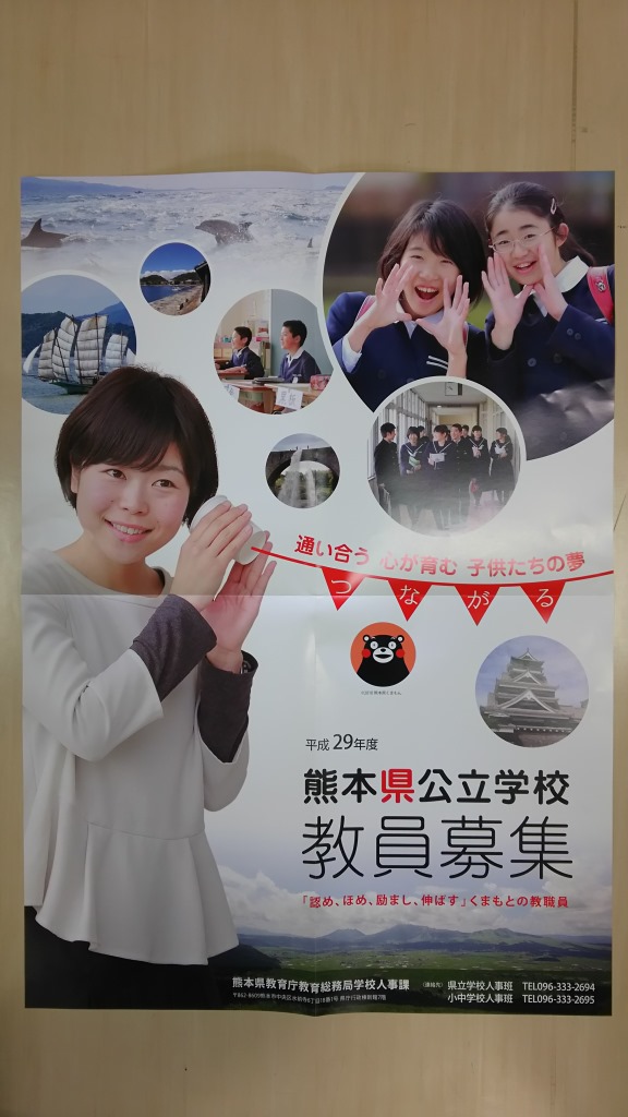 本校職員が標記ポスターの平成28年度モデルとして採用され、熊本県公立学校教員募集ポスターと募集パンフレットが完成しました。6年の児童も多数写真が掲載されています。先生をはじめ、どの子もとても明るい表情です。このポスターは熊本県内の小学校から大学までの学校はもちろん関東、関西方面の県関係の公共施設にも掲示されます。また、熊本県教育委員会HPにも掲載されています。