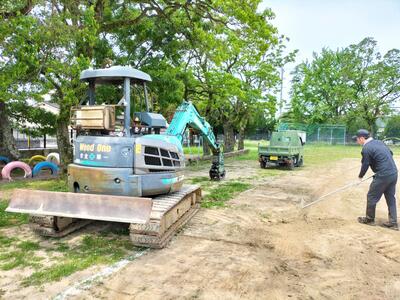 5月11日(土)の午前中、PTAの役員さんやボランティアの方、学校の職員で、グラウンドの整備を行いました。「トラック周辺の雑草が生えているところの土を、ブルドーザーで表面をはぎ、新しい土を入れてならす。」という作業です。役員さん方が手配してくださったショベルカーなどの重機も使いましたので、さながら工事の様相でした。おかげさまでかっこいいグラウンドに近づきました。
