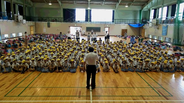 帰る用意をして全員体育館に集合しました。黄色い安全帽子がそろうと圧巻です。地区担当の職員とともに危険個所を考えながら一斉下校しました。