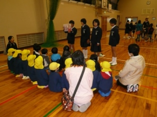 私はすずかけ保育園の担当でした。最初は上手にコミュニケーションがとれるか心配だったけど、保育園の人たちがたくさんにこにこしながら声をかけてくれたのでしだいにきんちょうもほぐれてきました。私たちは学校探検からスタートしました。みんなで手をつなぎながらいきました。私は5年生教室の担当でした。みんなを机にすわらせてあげたり、ランドセルをからわせてあげたりしました。ランドセルをからっている保育園児はとても楽しそうで目がキラキラしていました。(略)閉会式前、男の子が「もっとお兄ちゃんお姉ちゃんと遊びたかった。」というのを耳にしました。それだけ楽しんでもらえたんだとうれしく思いました。私自身もとても楽しい交流会でした。