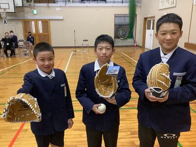 宮﨑校長から夢を持つことの大切さについて話がありました。その話の中で、メジャーリーガーの大谷翔平選手から寄贈のあったグローブの紹介もしました。折角なので、野球をしている児童にそのグローブをつけて、キャッチボールをしてもらいました。