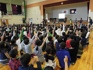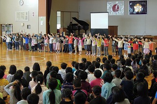 歓迎集会では、1年生を歓迎する言葉や1年生の元気な歌、リーダースタッフからの学校クイズなどがありました。
