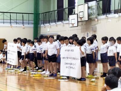 これは、今年度初の取組です。児童会目標「よりやさしく・よりかしこく・よりたくましく」をより具体的な目標にするために、いくつかの候補から、賛同する子どもの数が多いものにするという試みです。みんなで決めて、みんなで実行することが期待されます。