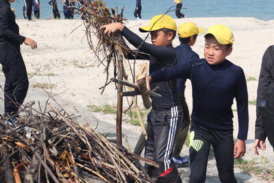 到着した後、湯の児の海水浴場を見ると、台風の影響か数多くの流木がありました。計画にはありませんでしたが、まずはその流木を全員で拾い、海水浴場をきれいにしました。いわゆるボランティアです。子ども達は学校でもボランティアによく勤しんでいますので、あっという間に美しい海水浴場に戻りました。