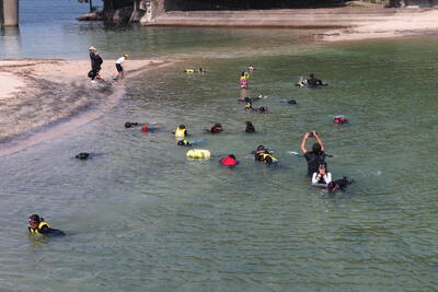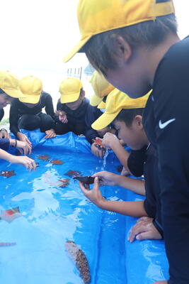 さて、本題の体験活動は、①タッチプールで湯の児の海の生き物を観察する②海へ入り実際に海の中の生き物を探したり、自然環境を確かめたりする、これら2つのことを行いました。