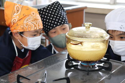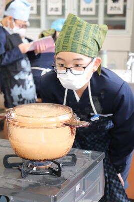 調理実習で使用するガラス鍋は、お米が炊ける過程、変化がよく見えます。その変化をよく観察しながら、火加減を調整し、おいしいお米を炊くことができました。