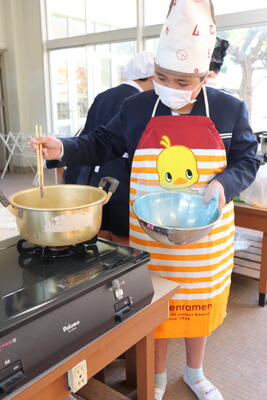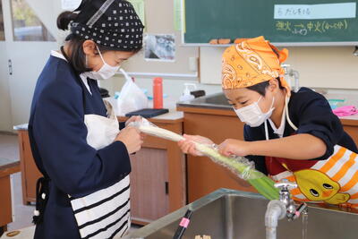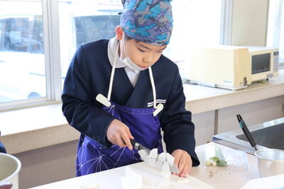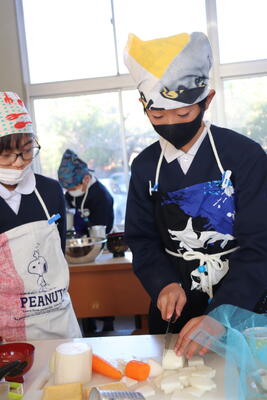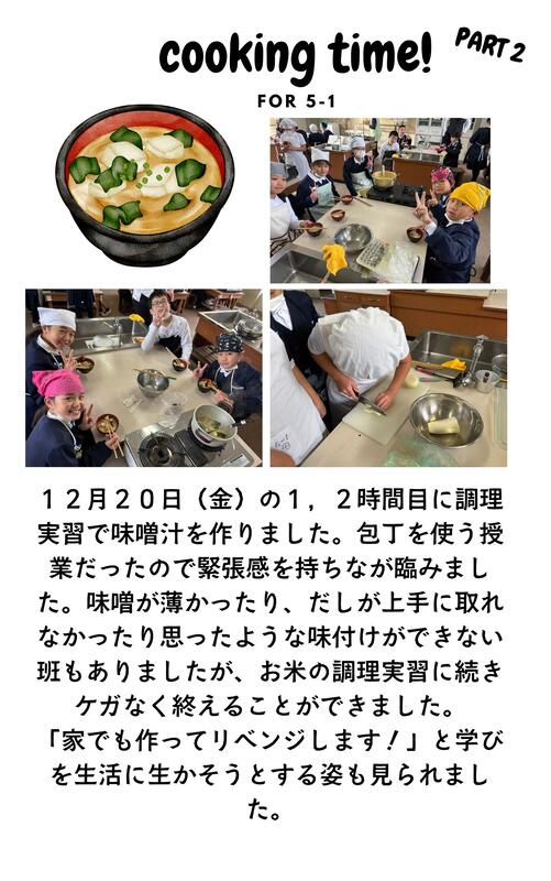 調理実習後の振り返りでは、「自分達は2時間かけておみそ汁をつくったけど、いつも親はあっという間につくてっているからすごいと思いました」という、経験したからこその振り返りが見られました。家庭生活の一員として、冬休みにも、家庭でおみそ汁づくりに挑戦してほしいと思います。