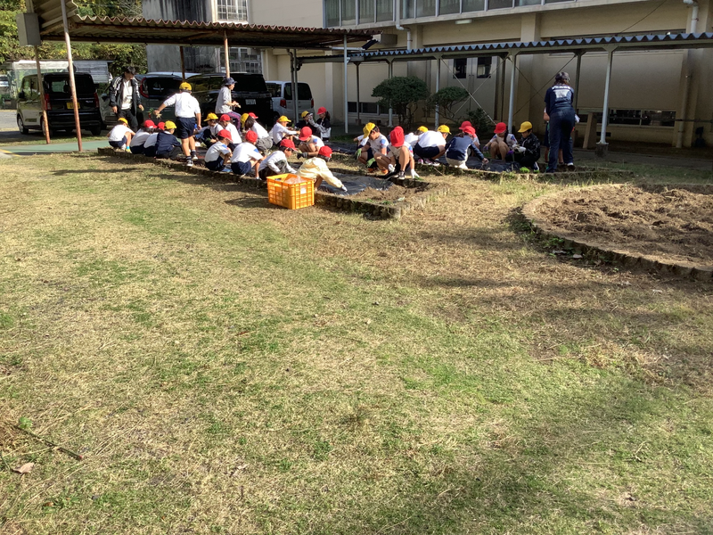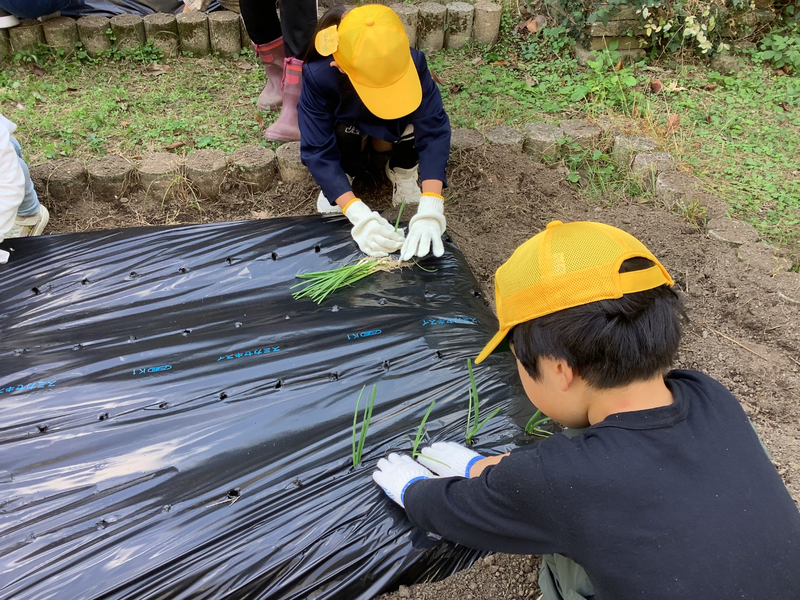 12月1日に3年生がサラ玉の苗植えを行いました。1学期に社会科で水俣の玉ねぎについて学習し、水俣の特産物であることを知り、育ててみたいという声が多く、総合的な学習の時間で玉ねぎづくりにチャレンジすることになりました。初めて苗植えをする子供も多く、最初にJAあしきたの方から植え方について聞きました。初めはぎこちなかった子供たちも少しずつなれ上手に植えることができました。最後はサラ玉について質問しました。