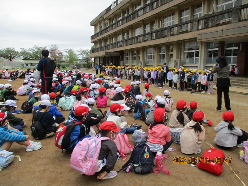 出発に先立って、全校児童が小運動場に集まり、歓迎集会を行いました。