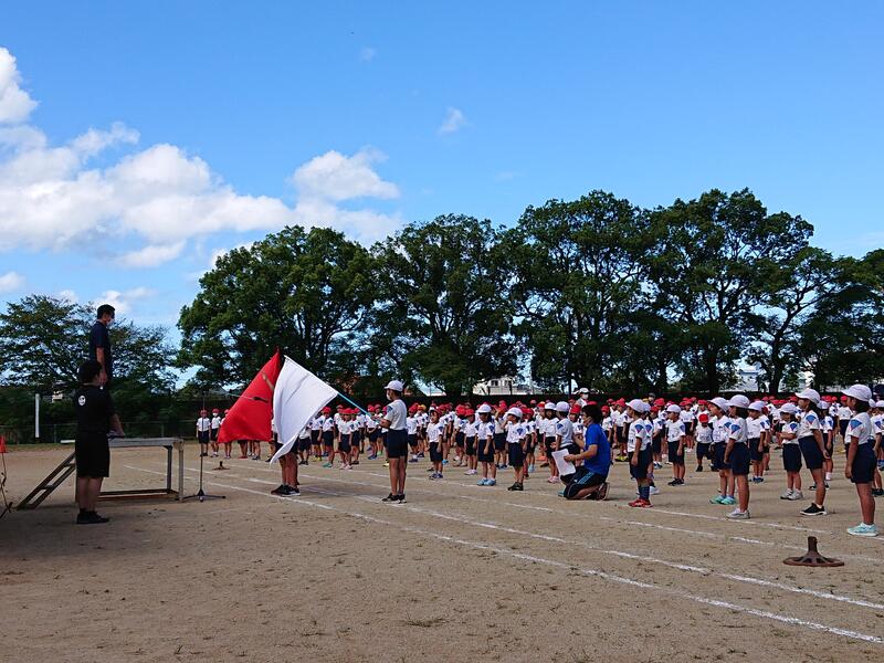 2校時でしたが、まだ暑い中、開会式や応援テントでの並び方などを練習しました。