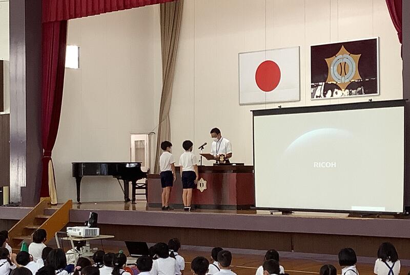 社会を明るくする運動の標語、恐竜絵画コンテスト、新体操の九州大会などで優秀な成績を収めた子供たちの頑張りをみんなで讃えました