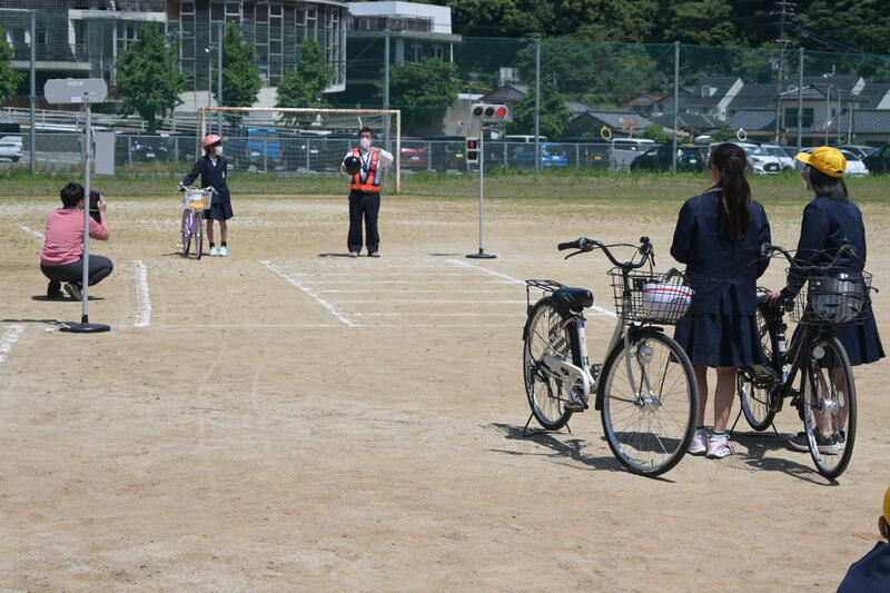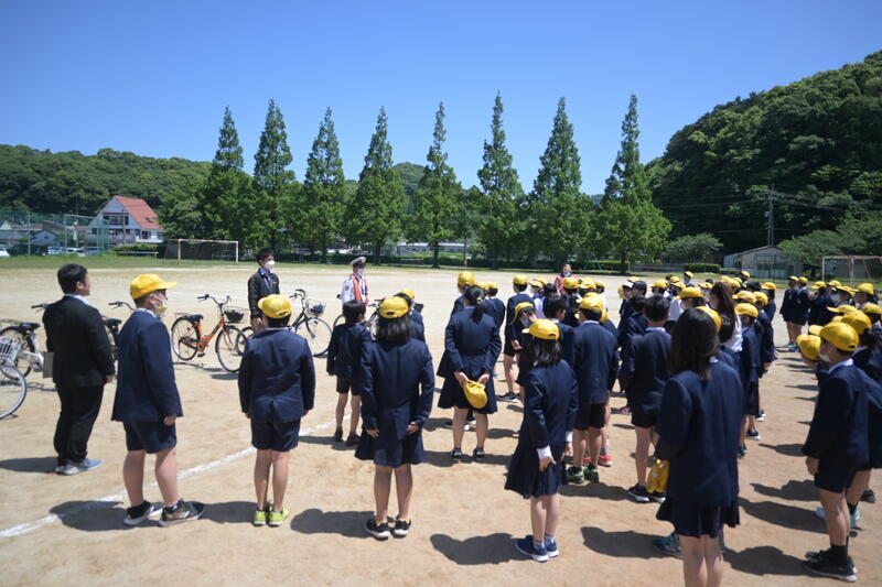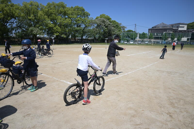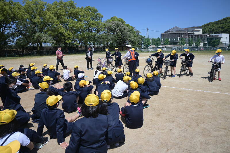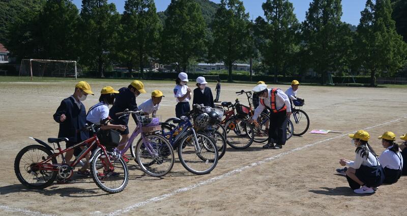 5月9日(火)、5年生は2時間目、6年生は3時間目に交通安全教室を大運動場で実施しました。すばらしい天気に恵まれ、久しぶりに自転車を使って安全な乗り方や点検の仕方などを学びました。