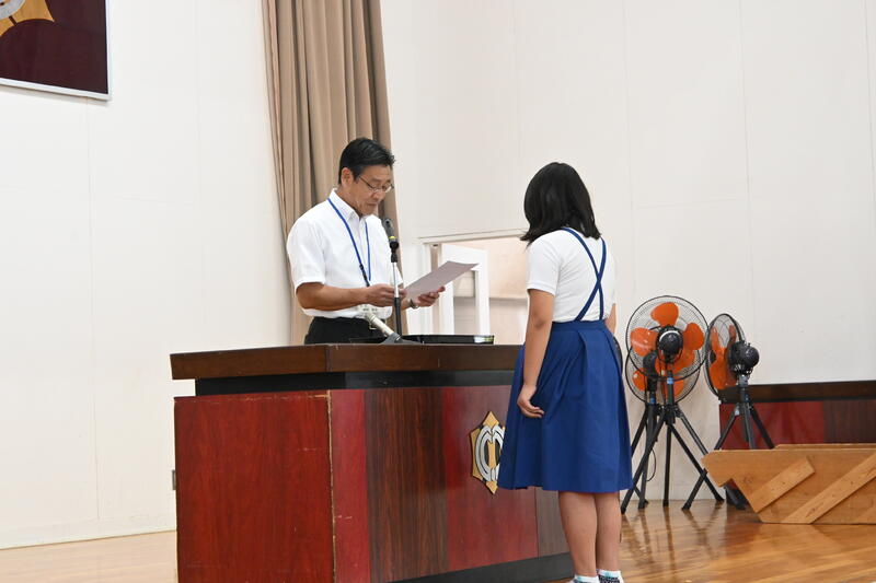 次に、第73回「社会を明るくする運動」標語に入選した児童の表彰を行いました。代表で、6年生が表彰状を受け取りました。