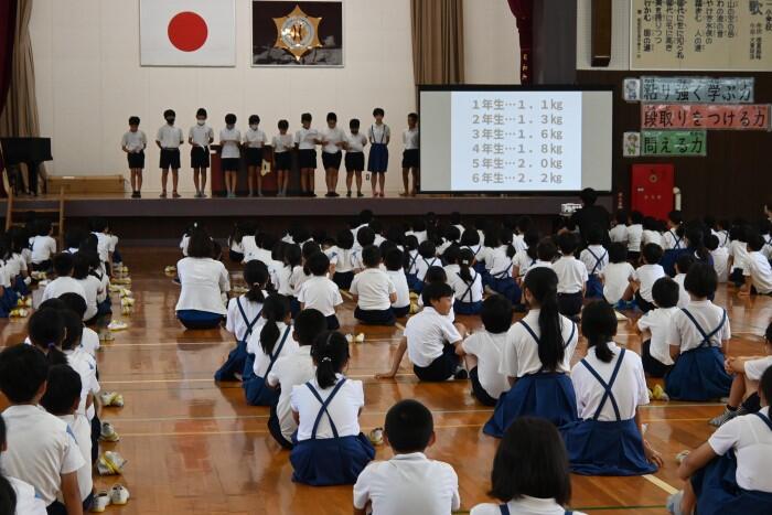 最後に、児童集会では、体育委員会から運動会に向けての取組が紹介されました。運動会に向け、更にグラウンドをきれいにするために「草取りバトル!10Kgの壁」という取組が紹介されました。
