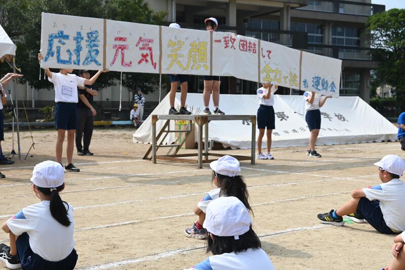 その後、運動会のスローガンがプロジェクト委員会から発表されました。各クラスの案を持ち寄り、代表委員会で「応援、元気、笑顔一致団結して全力で挑む運動会」に決定しました。