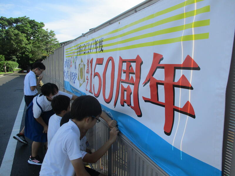 本校創立150周年をお知らせする横断幕を本校入り口に設置しました。