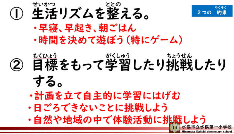 本日、「終業式」を実施しました。暑さを考慮しリモートで行いました。校長先生のお話しでは、1学期を「健・賢・虔」の3つの視点で振り返り、「約束」と「宿題」を2つずつ伝えていただきました。長い夏休みになりますが、事故や病気に気をつけ生活してほしいと思います。元気な子供たちと会えるのを楽しみにしています。