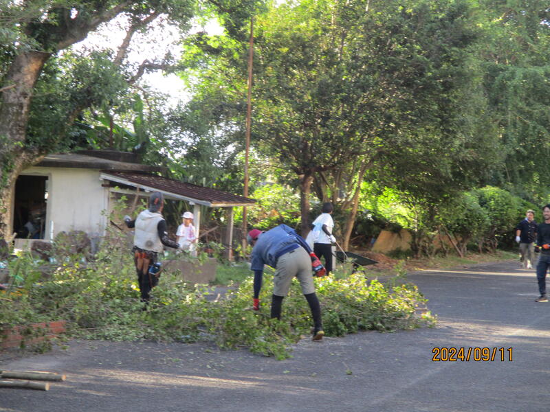 運動場の草を取ったり、草刈り機で草を刈ったり、切った木を運んだり