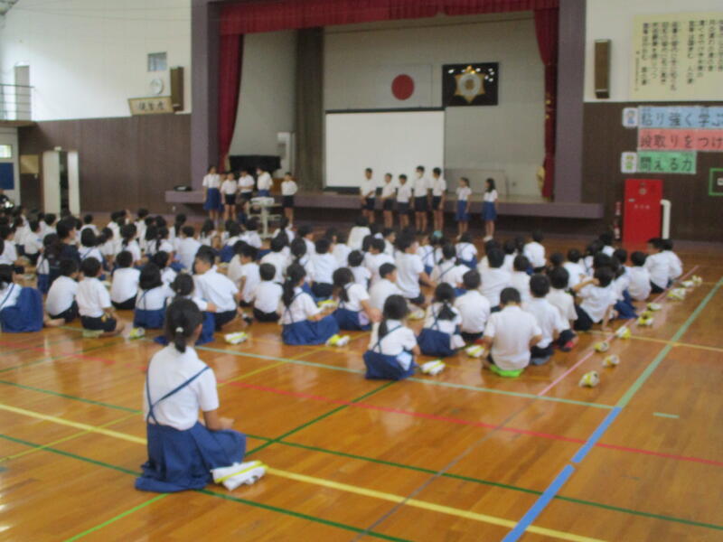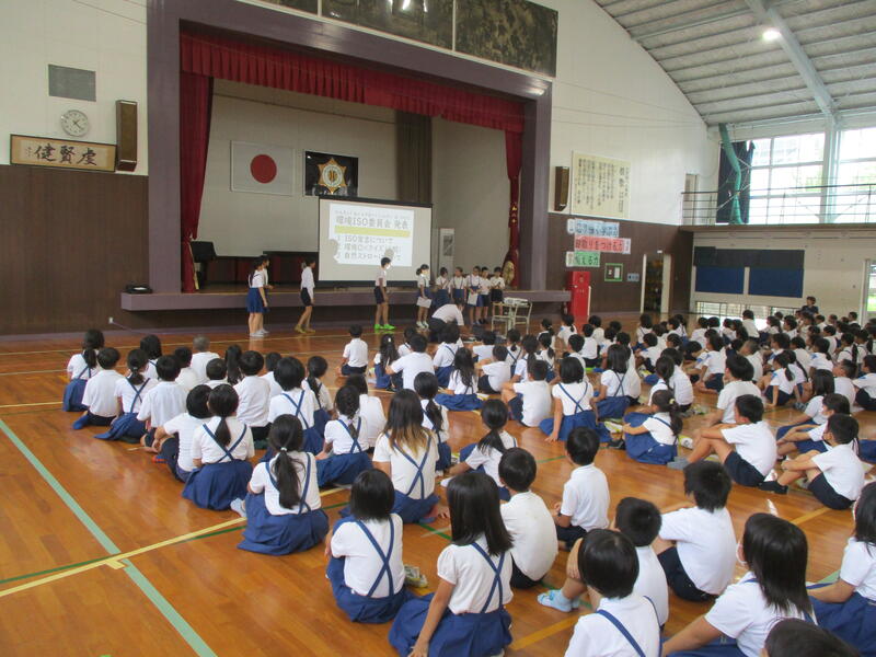 今月の児童集会(24日)の発表は、環境委員会、放送委員会、プロジェクト委員会の発表がありました。環境委員会は、環境ISOの取組や竹(セルロース)ストロー配布について話がありました。放送委員会は、無言掃除についての話やイントロクイズを行いました。プロジェクト委員会は、創立150周年記念に合わせてじっしする「心一つにプロジェクト」の一環として学校クイズを実施しました。