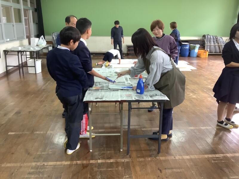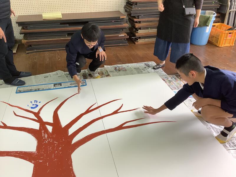 創立150周年記念事業の一環として「手形の木」プロジェクトを始めました。坂元先生にかいていただいた木が描かれた板に児童全員の手形をおします。最初は6年生が手形をおしました。これから17日までの昼休みに実施します。完成が楽しみです。