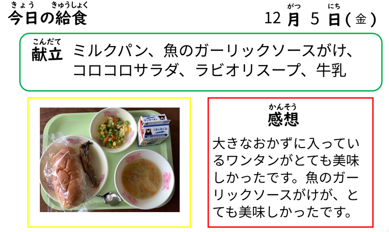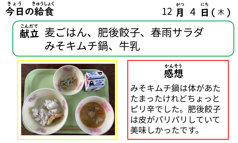 子供たちが写真を撮り「献立」「感想」を書いています。