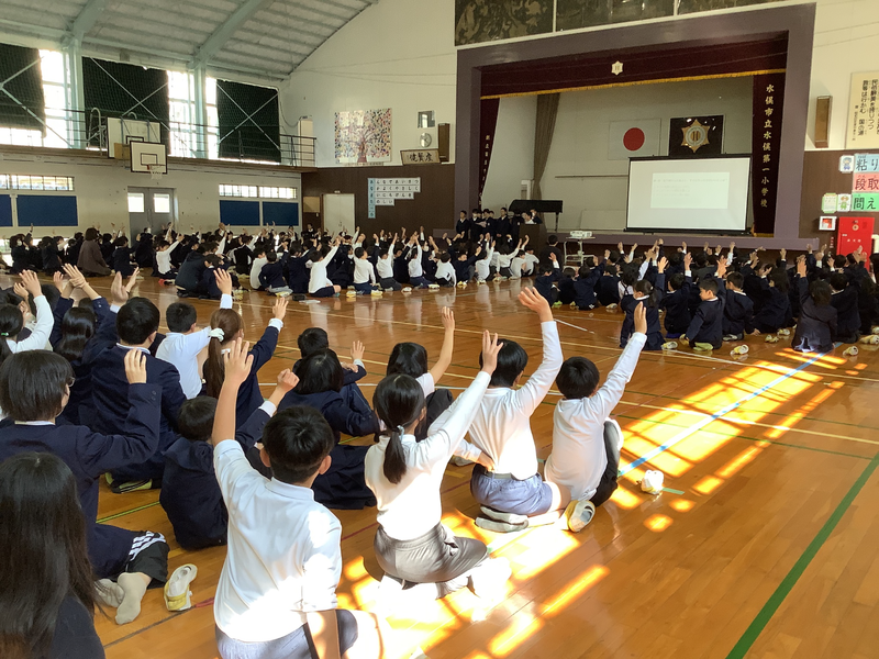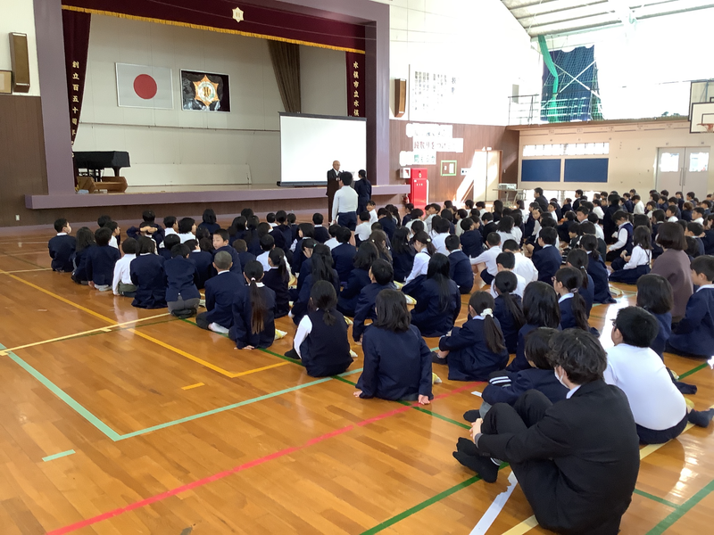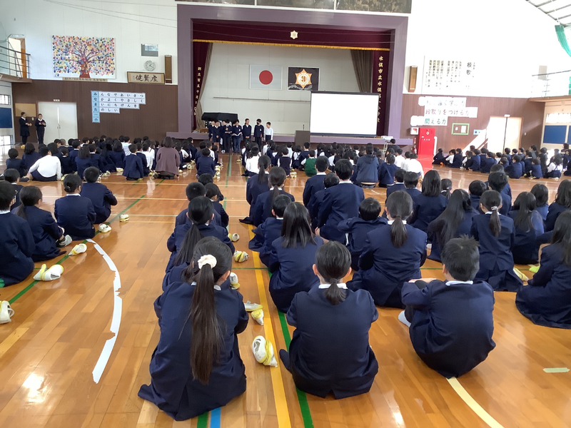 2月4日に児童集会を行いました。今回は体育委員会の発表でした。体育委員会は持久走大会に向けて速く走るフォームなどを教えてくれました。フリスビー大会のふりかえりではほとんどの児童が「楽しかった」に手を挙げていました。最後にあった表彰では「くまもと子ども美術展」の入賞者の表彰やソフトテニスの大会の表彰を実施しました。どちらも頑張って取り組んできた成果を発揮してくれました。