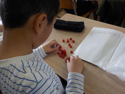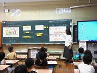 1年生は、3つの数の計算を1つの式にまとめて求める学習をしました。まずは数図ブロックを使って問題文をイメージし、上手に1つの式に表すことができました。また、考えを発表する場面では、予め発表の話形を示したことでたくさんの子どもたちが計算の仕方を発表することができました。話を聞く姿勢もしっかり整っており、入学からの成長がたくさん実感できた1時間でした。