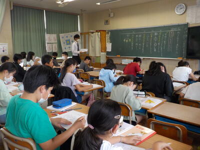 5年生:算数の授業は、「面積」の学習でした。これまでに学習した三角形の面積の求め方を参考に、平行四辺形の面積の求め方を様々な方法で考えていました。話を聞く姿勢がしっかり整っており、授業のほとんどはガイド役の子どもたちが進行するなど、随所に高学年らしい姿が見られました。