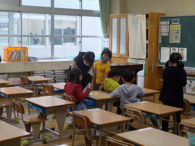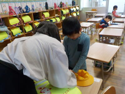 6年生が、朝の準備のお手伝いに来てくれて、とても嬉しそうな1年生!