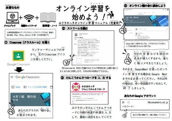 出席停止のときや休校でオンライン授業を受ける際の児童用マニュアルができあがりました。子どもたちには、8月26日に配布しています。