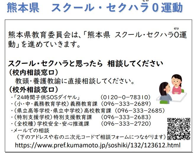 標記の件につきまして、熊本県教育委員会よりお知らせがありました。チラシを添付しています。アンケートへのご協力、よろしくお願いいたします。回答期間は、7月16日(火)から7月31日(水)です。