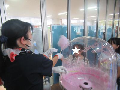 「わたがし」ブースでは、校長先生たちがわたがしを作りました。最後まで行列が尽きないほど大人気!