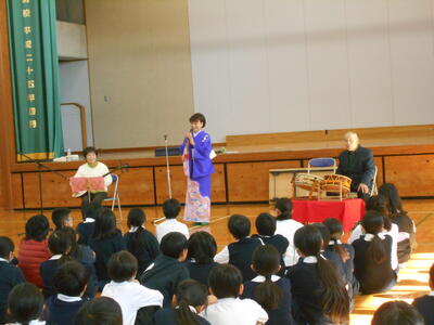 3、4年生の子どもたちに向けて、民謡の全国大会等で活躍していらっしゃる高見さんご夫妻、中山さんに来校いただき、民謡について学びました。
