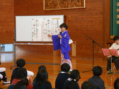 高見さんの歌声が三味線・太鼓の演奏に乗って体育館中に響き渡り、子どもたちもその迫力と素晴らしさに圧倒され、夢中になって聴いていました。