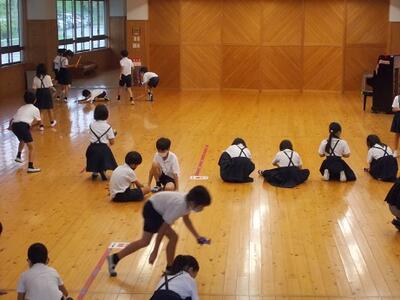 今日は、体育館で武者行列の歩き方の練習をしました。