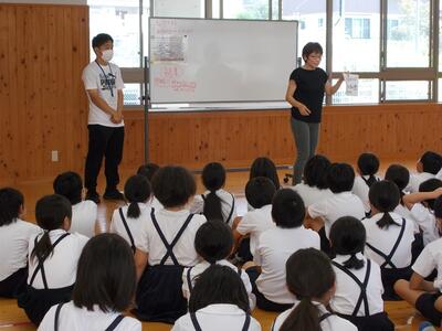 この日は、本校4年生が提案、デザインしたからいも君パッケージの納品式で、関係の方が大集合しました。