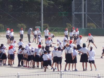 運動場に集合した後、1年生と6年生はペアで出発しました。