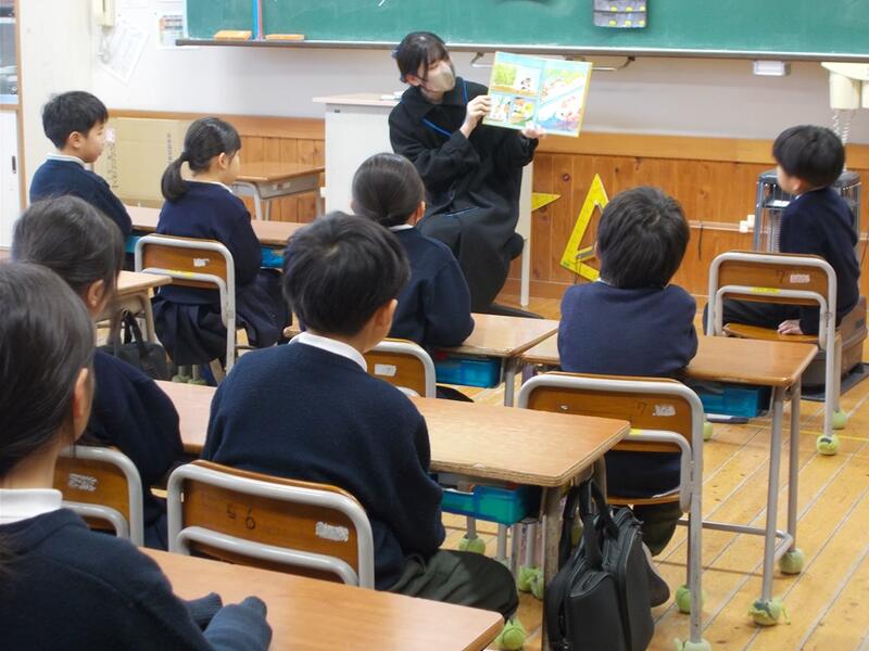 お隣の2年2組は、清原彩世さんが「オムライスかあちゃん」の読み聞かせ。大好きなメニューが題名になった絵本に夢中です。