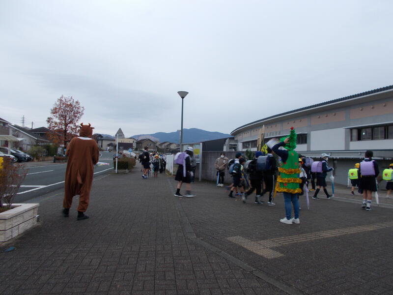 曇り空の中、登校する子どもたちをPTA役員の方々が楽しく迎えてくださいました。
