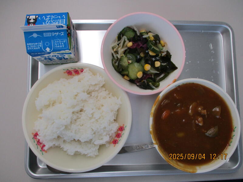 子供たちにも、職員にも大人気のカレーライス。夏野菜のカボチャや枝豆、なすなどが入っていて、栄養満点でした。海藻サラダも、ミネラル豊富。あっという間に食べてしまいました。