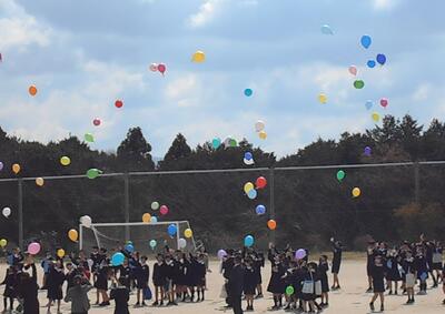式の後には、PTAの方々の企画でみんなでバルーンを飛ばしました。晴れた空にカラフルな風船が飛んでいく景気がとてもきれいでした。