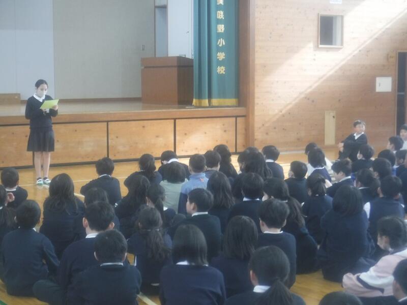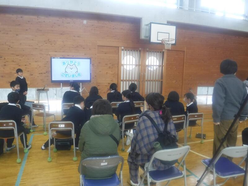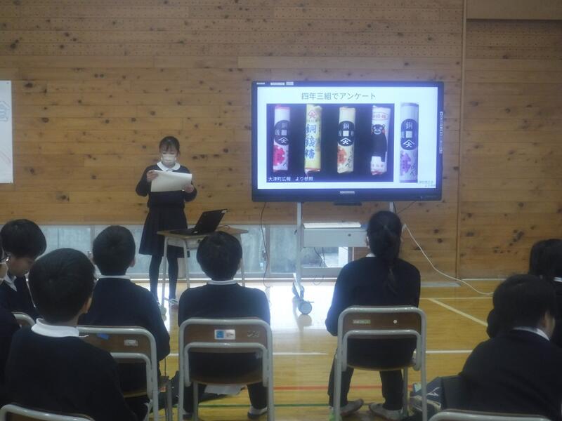 1月14日、体育館にて、4年生が、社会科、国語科、総合的な学習の時間をとおして大津町の特色や文化、歴史について学び、「まちづくり」を探究していた成果を発表しました。