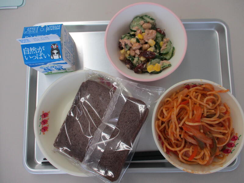 ココアパンにスパゲティ 投稿日時 : 04/14 教頭 今日の献立は ・ぎゅうにゅう ・ココアパン ・スパゲティナポリタン ・ビーンズサラダ です。 ココアパンにナポリタンの組合せはよかったです。サラダは、豆がたくさん入っていて、栄養満点でした。 今日も完食!おいしい給食ごちそうさまでした!