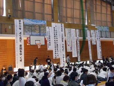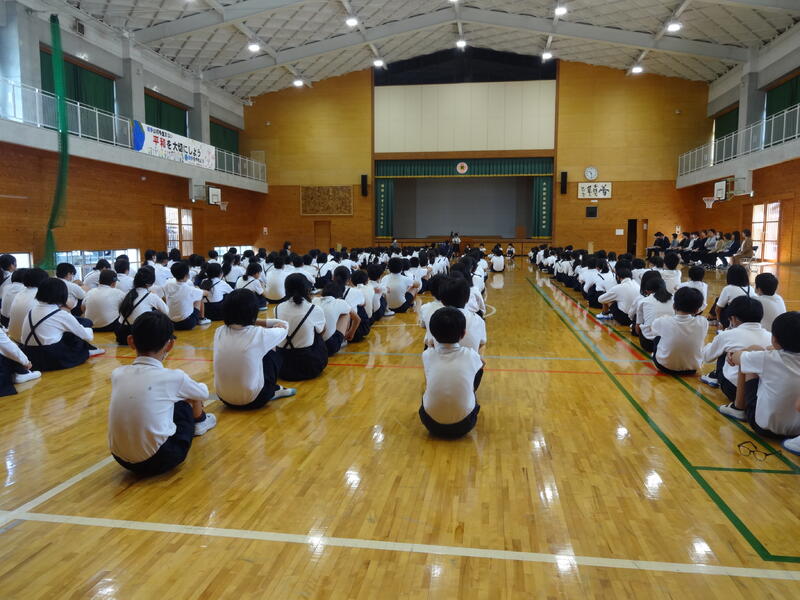 大津北中学校の体育館に、町内の500名を超える児童生徒が集まりました。
