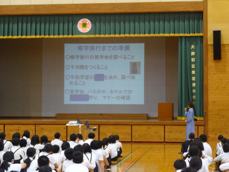 集会の後半は、絵本「おりづるの旅」の読み聞かせを行いました。11月上旬に長崎への修学旅行を予定していますが、平和集会で折り鶴を送るのは、「平和を願い、折り鶴が折られるようになったから」ということを紹介しました。