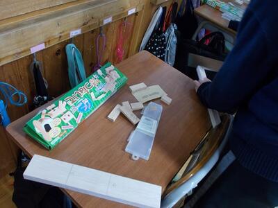 4年生の図工は、のこぎりで木材を切ってつなげる活動です。