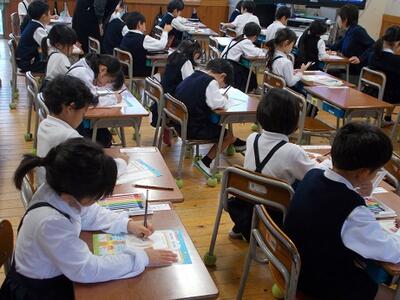 この時間、3~6年生は算数の学力調査(大津町)を受考中。